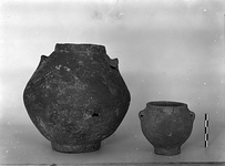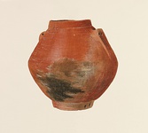 | Description: | Complete except for small chips. A neat pot with a good small foot ring, squat body with marked shoulder, and small mouth with low vertical rim and plain lip. Two small lug handles with double vertical piercings. To these correspond two pairs of holes (one pair not quite pierced through) in the foot ring, at either side below the handles. Coarse reddish brown clay, in part with gray core; red polished slip. | |
