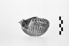Description:   The upper part broken away, and parts of the lower wall missing, with most of the handle. Round-bottomed lower body, ribbed; no foot. On the shoulder molded egg pattern between bands of raised dots; one horizontal rolled handle, with a molded ivy leaf beside its attachment.