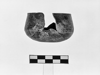 | Description: | Much of upper body and rim missing. Squat flat-bottomed bowl with straight rim tilted inward, and probably one horizontal rolled handle set just below the rim. Dull black glaze, somewhat peeled. | |