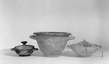 | Description: | Fragments of body missing; restored in plaster. Ring foot and shallow body with plain rim flanged inside to receive the lid; horizontal double rolled handles set at rim level. Dull red glaze, somewhat peeled inside; glaze band below handles at side. Cf. Agora XII, no. 1555. | |