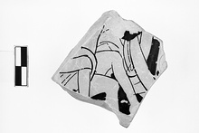| Description: | Part of the stem and floor; incised line around the stem. On the floor, part of a figure, nude save for a cloak over his arms, running right in a crouching position. Trace of some object at the extreme right. Partial relief contour. For the pose cf. P 2736. | |