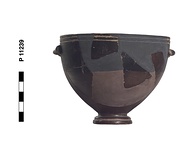 | Description: | About half the rim and wall restored in plaster. Moulded ring foot with incised groove, and pointed hemispherical body with plain rim grooved outside, drawn in slightly at the top. Reel handles applied horizontally outside below rim. Cornucopiae and leaves in terracotta paint and dot rosettes in white on body. Glaze black to red. | |