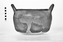 Description:   Fragmentary; restored in plaster. Deep round basin with rounded bottom and short offset rim flanged to receive the lid inside. Horizontal rolled handles on the shoulder, projecting above the rim. Fine grooving around the lower body.
