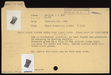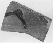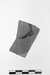 | Description: | Depicts leg in horizontal position so that figure was prostrate or swimming or running rapidly. Brownish glaze on a slip of the pinkish brown clay; incision for ankle and toes. Inside covered with silvered black glaze. Cf. P 268 which may be from same vase. | |