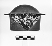 | Description: | Two non-joining fragments of a flanged pyxis; on the upper face of the flange, a row of white dots; below it, an elaborate grapevine band with hanging clusters in terractota paint. Glaze black to reddish-brown. | |