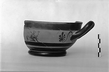 | Description: | Crouching satyrs depicted on either side. Mended from eight pieces. Nearly half missing, including one handle and the head and front of one satyr. The preserved satyr holds a drinking horn in his extended left arm. Red is used for the beard, incision for interior markings. Shape and subsidiary ornament those of P 1137. Preserved satyr and rim above him grayed in the firing. Possible traces of graffiti underneath. | |
