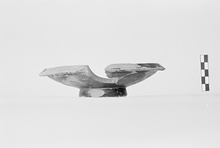 | Description: | About one-third of rim and floor missing. Ring foot; down-sloping rim. Dull black glaze over all, worn. | |