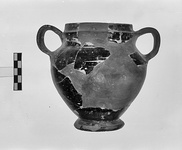 | Description: | Fragments of rim and wall missing, with one handle; restored in plaster. Heavy flaring ring foot; ovoid body; vertical rim, the upper part inset. Broad rising band handles without spur. Black glaze with metallic splotches; reddened at the bottom and inside. | |
