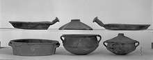 | Description: | Most of the rim missing; restored in plaster. Lumpy knob. Coarse micaceous brownish-black clay. | |