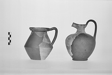 | Description: | Oinochoe with beaked spout. About half preserved; most of the handle and much of the base missing. Restored in plaster. Small eggy body; low ring foot; short narrow neck with flaring lip plain with two grooves outside, at the back; but at the front, finished with a projecting spout, cut away above and grooved around its lip beneath. High swung grooved handle. Brownish-red clay; black glaze on lip outside not reaching to the bottom, and on inside of lip. | |
