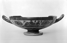 | Description: | Mended from many fragments. Missing less than a third of the rim, a chip from the base, and small interior chips. Two reclining figures on either side, facing left. Blobby filling ornament at level of their heads. Accessory red for fillets and garment folds, white for the garlands around their necks and for the central dot on the outer part of the eye ornament. Scene on the other side very fragmentary; slight variation in pose. Interior glazed save narrow reserved band, at rim and reserved center with dot within circle. Resting surface of the base reserved and top of hollow inside. The very short stem colored red. | |