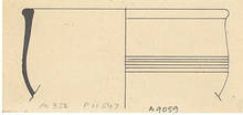 | Description: | Single fragment preserves part of rim of open bowl. Three shallow grooves around body at bottom of vertical part of wall. Clay grayish-brown, flaky; soapy and micaceous. Rather thin dull red glaze, inside and out. | |