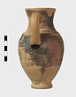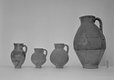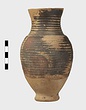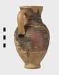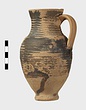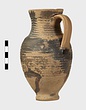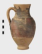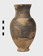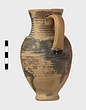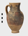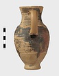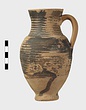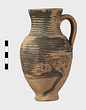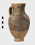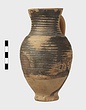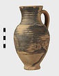 | Description: | Handle and fragments of lip missing; otherwise intact. Narrow ovoid body on rather high ring foot; high concave neck-mouth. Horizontal ribbing on neck (lip plain) and upper part of body. Glaze (dull black to red; sometimes worn off) on upper part of body, neck and inside mouth. | |