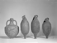 | Description: | Two non-joining fragments of neck preserved. Restored in plaster. Small concave foot; broad shoulder, forming an angle with squat body; lip concave above a ridge; neck and handles probably tall. Pinkish to buff clay. Light buff slip. Cf. P 9876 (Υ 382) for complete shape. | |