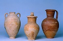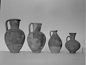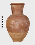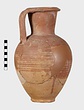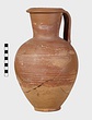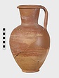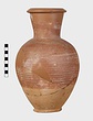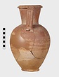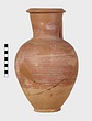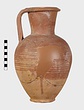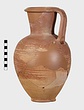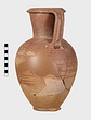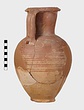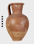 | Description: | Fragments of mouth and body missing. Ovoid body on ring foot; tall neck, slightly wider above than below; round mouth with projecting rim ridged above; grooved band handle from lip to shoulder. Light ribbing at center of body. Dull red glaze except toward lower part of body. | |