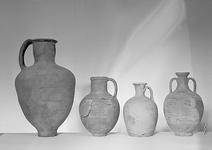 | Description: | Some of body missing; restored in plaster. Egg-shaped body, grooved; narrow neck with heavy flaring lip; two ridges at shoulder and neck, at handle attachments; "double" handles. Brown clay. Unglazed. Light buff slip mostly peeled off. | |