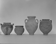 | Description: | Many fragments of body missing; restored in plaster. Small flaring ring foot; plump ribbed body; low neck-mouth, ridged at lip; two small vertical ridged handles on shoulder. Brownish clay. Unglazed. | |