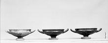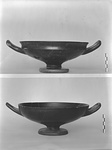 | Description: | Mended from many pieces. Parts missing from bowl. Fine solid glaze fired red at concave lip. Reserved: inside of handles and between attachments, outside of foot, resting surface and top of stem underneath, with circle and dot. Collar above foot shows remains of red. Cf. Caskey (1922), Geometry, p. 181, no. 135 (early red figure). | |