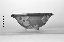 | Description: | One handle and much of rim and wall restored in plaster. Flaring ring foot; open rounding body; deep flaring lip, grooved at inner and outer edge; horizontal handles set on shoulder, formed by junction of wall and rim, and rising to meet rim. Grayish clay with thin black to red-brown wash on interior. | |