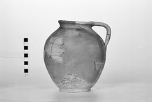 | Description: | Body fragmentary. Restored in plaster. Flat bottom, slightly projecting; plump eggy body; no neck; short flaring rim; vertical strap handle to lip. Light gray clay with bits. | |