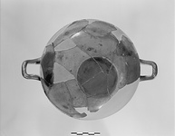 | Description: | Mended from many fragments. About half the rim missing; interior gaps. Most of interior and upper part of exterior fired light reddish-brown. Sharp lines of distinction; the interior shows, somewhat off center, a solid circle of greenish-black, over which a kylix foot just fits. Glaze much worn from handles, cloudy on underside of base. Shape and decoration as P 1173-P 1174. | |