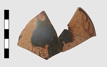 | Description: | Three joining fragments, retaining parts of a leopard on either side. Hasty drawing; no relief contour; glaze brown to black. Fragments of at least two other similar askoi in red figure remain in the tray. | |