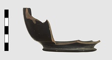 Description:   Handles and much of wall missing. Low profiled flaring base ring; almost vertical wall. On underside alternate black glaze and reserved. On floor five impressed palmettes around a circle of ovules. Scraped groove around lower wall outside.