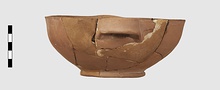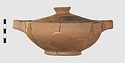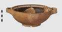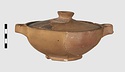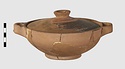 | Description: | One handle and much of wall both of lid and bowl missing; restored in plaster. Low false base ring; deep bowl with inside ledge for lid. Horizontal strap handles. Slightly domed lid with heavy hollow knob. Bowl black glazed on inside; the lid black glazed on most of its top. | |