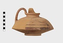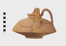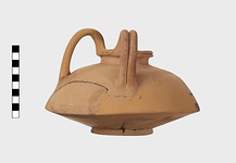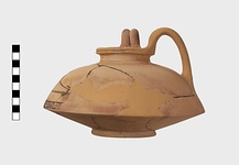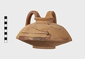 | Description: | One handle and fragments of wall missing; strengthened with plaster. Angular profile with domed top; low neck-mouth with projecting lip grooved on outer face; two double handles. | |