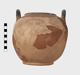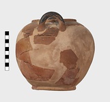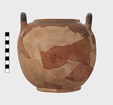 | Description: | Many fragments missing from wall and base; restored in plaster. Ovoid body; open mouth with rolled lip; two vertical loop handles on shoulder. Low ring foot. Reserved, save for bands of brown glaze below lip and handles and tops of handles. | |