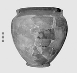 | Description: | Many fragments missing from wall. Deep jar with open top and inside ledge for (missing) lid. Much restored in plaster. Two vertical loop handles pressed close to rim. Thin brown wash, almost entirely flaked away, on inside, in a band around the shoulder, and on tops of handles. | |