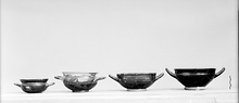 | Description: | Mended from many fragments. Missing nearly half of rim and interior pieces. Glaze flaked and worn. Reserved: line inside rim, inside of handles, ring of foot. A red line passes around just above the handles within the slight concavity of the lip. Beneath, scratched in the glaze: <graphic> | |