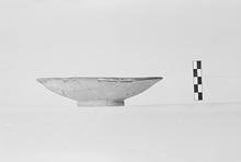 | Description: | Less than half preserved; completed in plaster. Base ring. Two grooves about inner edge of thickened slightly out-turned rim. Poor black glaze on inside with trace of kiln stacking; outside unglazed. | |