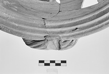 | Description: | About one-third of side with rim and bit of floor preserved. Flat bottom; spreading sides; horizontal rim with three grooves; one horizontal twisted handle, pressed onto underside of rim, preserved. Red-buff to buff clay. Red wash on inside. Cf. Agora XXXIII, no. 282. | |