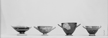 | Description: | Put together from many fragments. Chips from the rim, larger ones from the foot, and interior gaps; both handles complete. Rim concave outside with distinct angle of offset inside. Canted handles. All over black glaze (no handle reserve) except beneath within foot (circle and dot). Fine fabric. Good glaze fired red over large patch on one side, reddish and cloudy on underside of spreading foot. ADDENDA Note single purple line around exterior just above handles. Good parallel, with purple well preserved, on rim fragment from same shape in Perachora inscribed fragments. | |