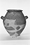 | Description: | Full profile preserved; missing pieces restored in plaster. Base ring; low bulging body; two horizontal ridged strap handles, just above point of greatest diameter; wide flange for cover just below low slightly inturned rim. Decorated in red: two bands at upper side of handle attachments and traces of garland(?) design above; vertical lines run up from handle attachments. Pale greenish-gray to buff clay. Buff slip. Rim broken and repaired with rivet. | |
