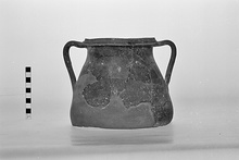 Description:   Bottom entirely missing; parts of side and rim restored in plaster. Shape similar to P 11904 (Χ 939), except for rather more slender body, two grooves on outside of rim and more angular handles.