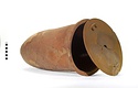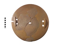| Description: | Flat disk with hole surrounded by a groove in center. Just inside of preserved edge, a short ridge with two holes beside it. Grooves continue line of ridge. Fragment b) is a non-joining rim piece with three grooves. Restored in plaster. Coarse (brick-like) clay. Cf. Agora XXXIII, no. 371. | |