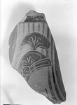 | Description: | Neck fragment with broad red band to left, black band to right; heavy raised ring near upper edge. Details of helmet of Athena indicated by coarse incision, against striped background. | |