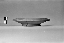 | Description: | Piece of rim missing. Low base ring; downturned double-grooved rim. Restored in plaster. Outside and rim unglazed. Floor covered with thin red glaze. | |