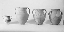 Description:   Fragmentary upper part preserved; nothing of base; more than half the lip missing, most of one handle, and much of the walls. Restored in plaster. A small wide-mouthed amphora with band handles from lip to shoulder. The rim pushed out, front and back, to make a trefoil pouring lip. Lower body banded, with a row of dots at point of greatest diameter. On the shoulder panels of checkerboard on either side of panels filled by interlocking latticed triangles. The mouth glazed.