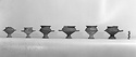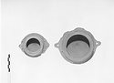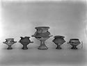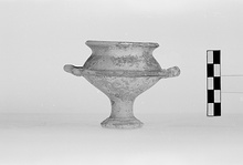 | Description: | A chip missing beside one handle. Flaring foot, wheel-ridged on its top, concave beneath. High stem. Rounded body, with a narrow projecting flange at the point of greatest circumference. Two small horizontal handles attached to the flange, which is pierced beside each attachment. Flaring rim, slightly thickened. Pinkish clay, thick flaky white paint over red slip. | |