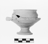 | Description: | One handle and chips missing. Foot flat below, edge rounded; keel not set off from lower wall; upper wall relatively straight, lip low and thick. Unpierced. Pinkish-buff clay partly fired light buff at surface (or slip?), traces of dull blackish glaze on flange between attachments of each handle. | |