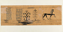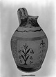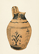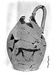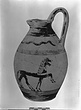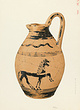 | Description: | Much missing, including nearly all of the trefoil mouth; restored in plaster. Ring foot and double rolled handle. The neck seems to have been glazed; on the shoulder below it a wavy line. On the body, two panels of very complicated dotted maeander, two elaborate floral designs and a pair of winged(?) horses marching abreast to the right; their heads are missing. Buff clay; black glaze much peeled. | |