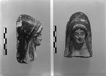Description:   The vase to which this was presumably attached is not preserved but this part is complete though chipped. On the front, in high relief, a woman's head and neck full face. Eyebrows and outlines of eyes drawn in black, also the cord of a necklace. Red on hair, lips, eyes and three pendents to the necklace. The face and hair are framed by a projecting band (red zigzag between black line on the cream slip). This band is the front edge of the wider back part of the object which forms a sort of headdress, and is covered with black glaze. Its back edge shows probable traces of attachment all the way up and down except where chipped; just within edge, slopped-over glaze; inside otherwise smoothed but not glazed. The lower edge probably hung over; the center is chipped away but the extremities show red paint.