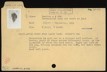 | Description: | From large vase. Decoration of horse's leg in matte red on a slipped buff surface. At bottom, parts of three narrow horizontal bands, on the uppermost of which the hoof rests. Right and left of the leg, filling ornament (to the left, two small blobs only). Back left plain. | |