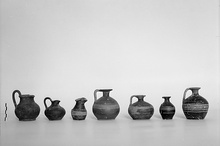 | Description: | Intact. Round-bodied jug on low flat base; narrow neck; flat projecting lip; band handle, lip to shoulder. | |
