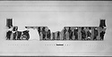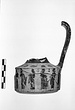 Description:   Mended from many fragments. Most of the neck missing (one non-joining piece preserved); gaps in sides. Squat body; high swung double handle, with three rivet bosses where it attaches to the lip. Handle and neck covered with worn brownish glaze inside and out save under arch of handle. On rising shoulder, palmette decorative border. The sides are nearly vertical, flaring slightly to their angle with the shoulder. They are reserved and decorated with a series of figures: about the center, front, is a nude or semi-nude slim-waisted male figure (upper part missing) between two girls in belted short-sleeved dresses, the right (better preserved) holding a slender staff. The rest of the field is taken up with six pairs of mantled figures in conversation, five standing and one seated on cross-legged stools; they are punctuated by hanging fillets and vertical rows of dots.