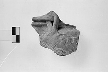 | Description: | Rim piece. Angular shoulder separated by deep groove from short straight lip. Horizontal handle on lip connected to side wall with vertical loop. Ovules and rosettes in relief on side. Dark gray clay. Glaze discolored by acid. Lead Glaze Bowl. | |