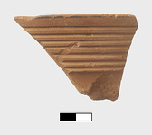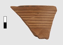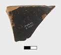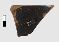 | Description: | Fragment from upper wall and rim. Around the top of the wall, a broad collar with seven grooves. Black glazed on inside and on top of rim. | |